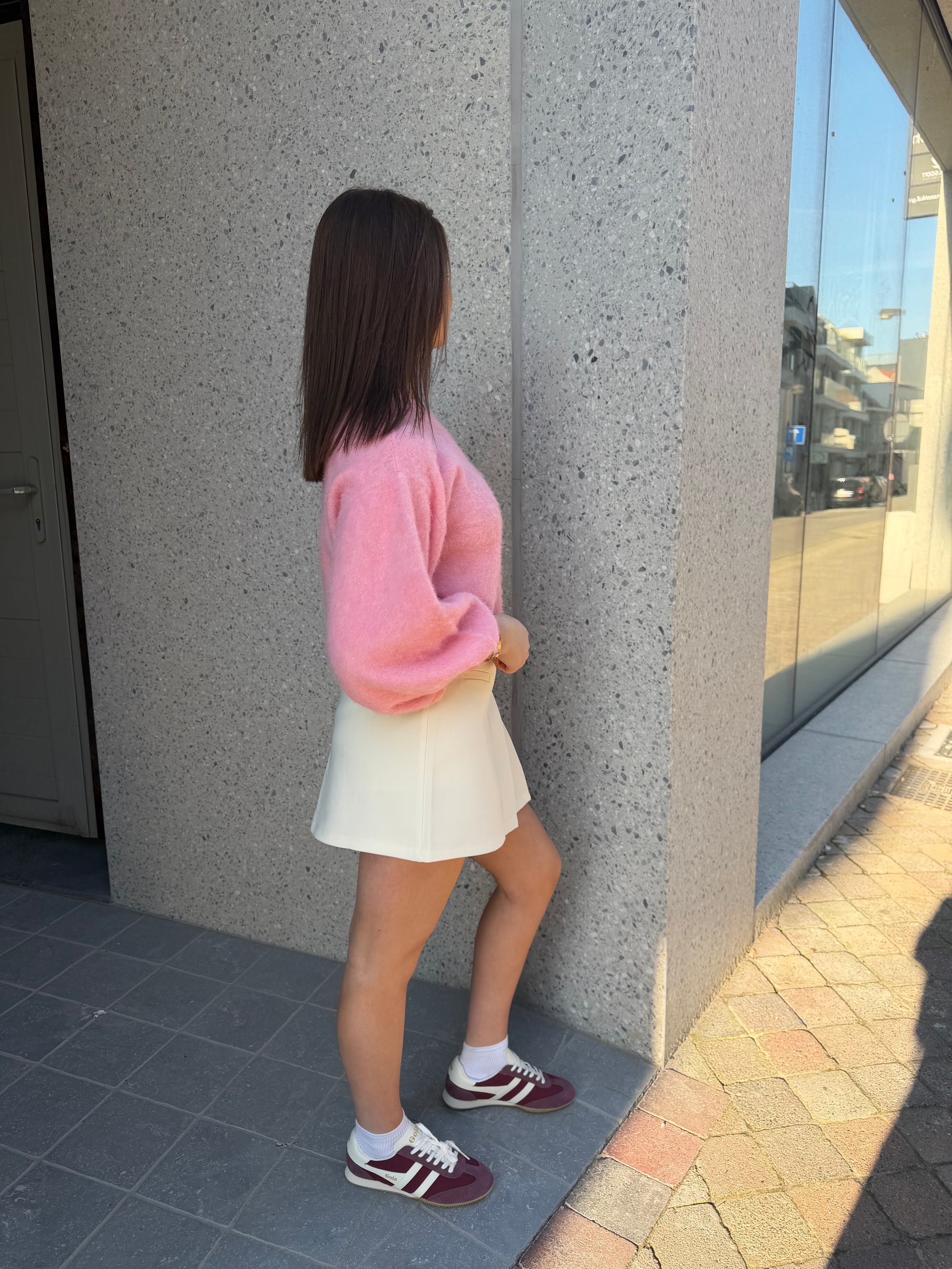 Het model is 1m65 en draagt maatje XS. Er zit een short onder het rokje.